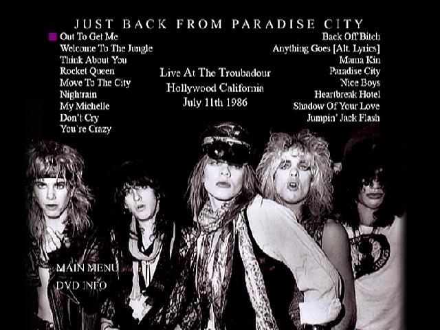 1. Out Ta Get Me 2. Welcome to the Jungle 3. Think About You 4. Rocket Queen 5. Move to the City 6. Nightrain 7. My Michelle 8. Don’t Cry 9. You're Crazy 10. Back Off Bitch 11. Anything Goes (Alt. Lyrics) 12. Mama Kin 13. Paradise City 14. Nice Boys 15. Heartbreak Hotel 16. Shadow of Your Love 17. Jumpin’ Jack Flash