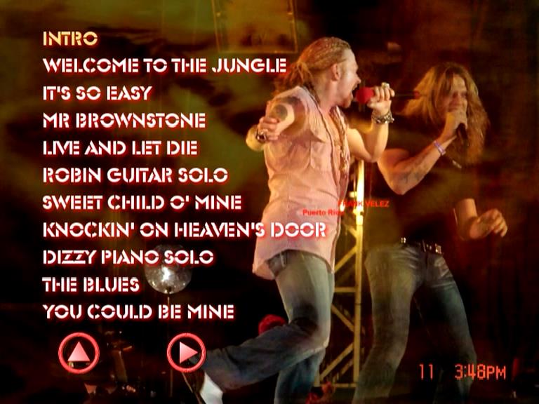 1. Intro 2. Welcome to the Jungle 3. It's So Easy 4. Mr. Brownstone 5. Live and Let Die 6. Robin Guitar Solo 7. Sweet Child O' Mine 8. Knockin' on Heaven's Door 9. Dizzy Piano Solo 10. The Blues 11. You Could Be Mine 12. Axl Piano Solo 13. November Rain 14. Richard Guitar Solo 15. Richard & Robin Guitar Solo 16. My Michelle (with Sebastian Bach) 17. You Gotta Move (with Izzy Stradlin) 18. Think About You (with Izzy Stradlin) 19. Patience (with Izzy Stradlin) 20. Nightrain (with Izzy Stradlin) 21. Paradise City 22. Outro