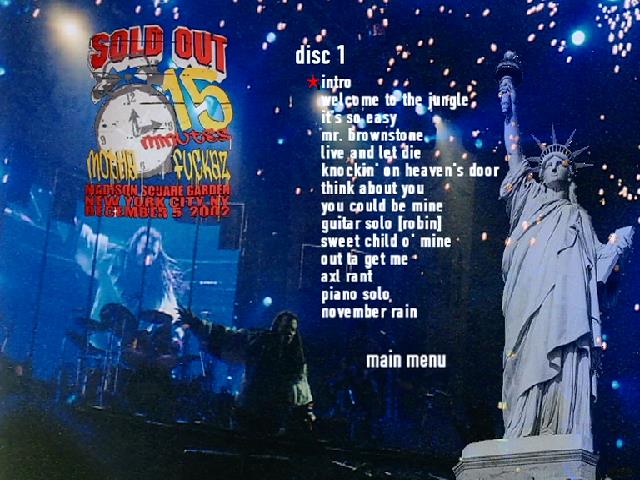 1. Intro 2. Welcome to the Jungle 3. It's So Easy 4. Mr. Brownstone 5. Live and Let Die 6. Knockin' on Heaven's Door 7. Think About You 8. You Could Be Mine 9. Guitar Solo (Robin) 10. Sweet Child O’ Mine 11. Out Ta Get Me 12. Axl Rant 13. Piano Solo 14. November Rain