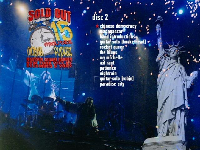 1. Chinese Democracy 2. Madagascar 3. Band Introduction 4. Guitar Solo (Buckethead) 5. Rocket Queen 6. The Blues 7. My Michelle 8. Axl Rant 9. Patience 10. Nightrain 11. Guitar Solo (Robin) 12. Paradise City