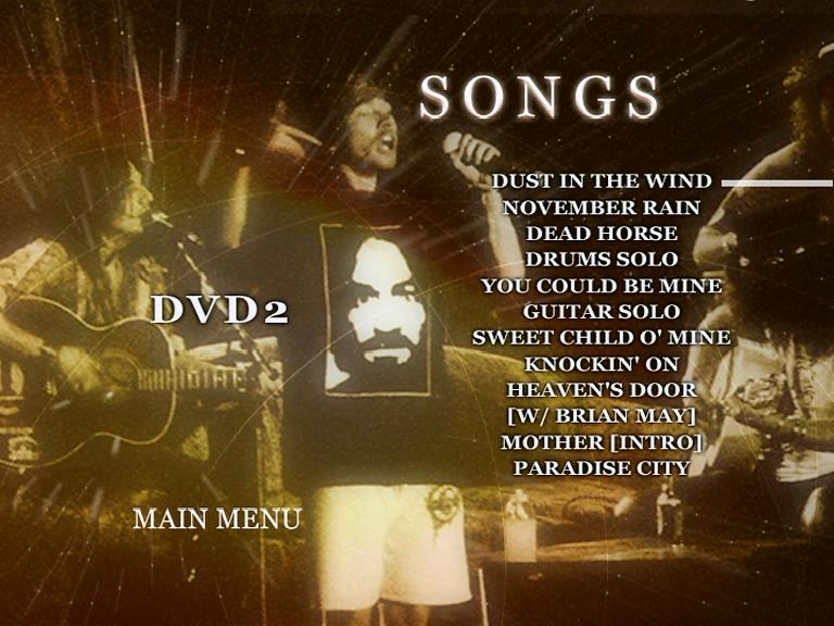 1. Dust in the Wind 2. November Rain 3. Dead Horse 4. Drums Solo 5. You Could Be Mine 6. Guitar Solo 7 Sweet Child O' Mine 8. Knockin' on Heaven's Door (with Brian May) 9. Mother (Intro) 10. Paradise City
