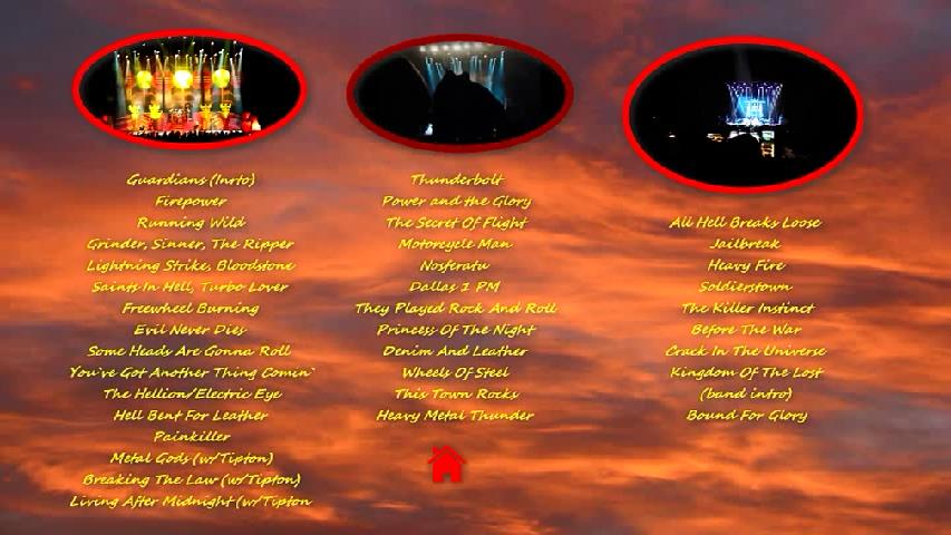 1. Guardians (Inrto) 2. Firepower 3. Running Wild 4. Grinder 5. Sinner 6. The Ripper 7. Lightning Strike 8. Bloodstone 9. Saints in Hell 10. Turbo Lover 11. Freewheel Burning 12. Evil Never Dies 13. Some Heads Are Gonna Roll 14. You've Got Another Thing Comin' 15. The Hellion/Electric Eye 16. Hell Bent For Leather 17. Painkiller 18. Metal Gods (w/Tipton) 19. Breaking the Law (w/Tipton) 20. Living After Midnight (w/Tipton)