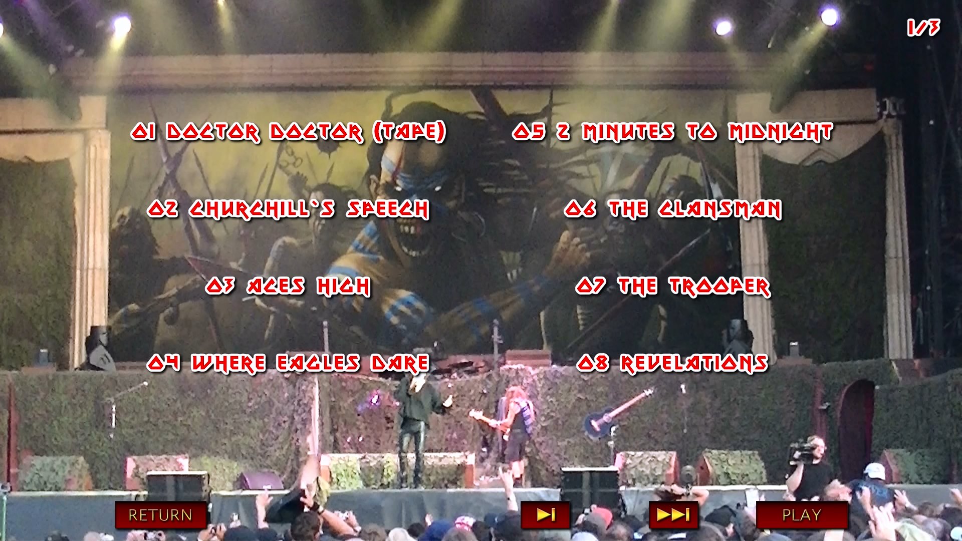 1. Doctor Doctor (Tape) 2. Churchill's Speech 3. Aces High 4. Where Eagles Dare 5. 2 Minutes to Midnight 6. The Clansman 7. The Trooper 8. Revelations 9. For the Greater Good of God 10. The Wicker Man 11. Sign of the Cross 12. Flight of Icarus 13. Fear of the Dark 14. The Number of the Beast 15. Iron Maiden 16. The Evil That Men Do 17. Hallowed Be Thy Name 18. Run to the Hills
