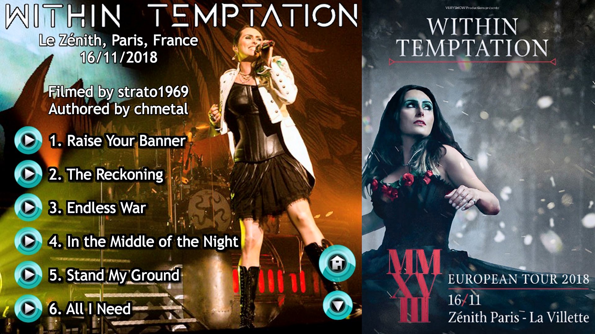 1. Raise Your Banner 2. The Reckoning 3. Endless War 4. In the Middle of the Night 5. Stand My Ground 6. All I Need 7. Supernova 8. Shot in the Dark 9. The Promise 10. Ice Queen (Liefde voor Muziek Acoustic Version) 11. Faster 12. Mercy Mirror 13. Paradise (What About Us?) 14. The Heart of Everything 15. What Have You Done 16. Forgiven 17. Mother Earth 18. Stairway to the Skies