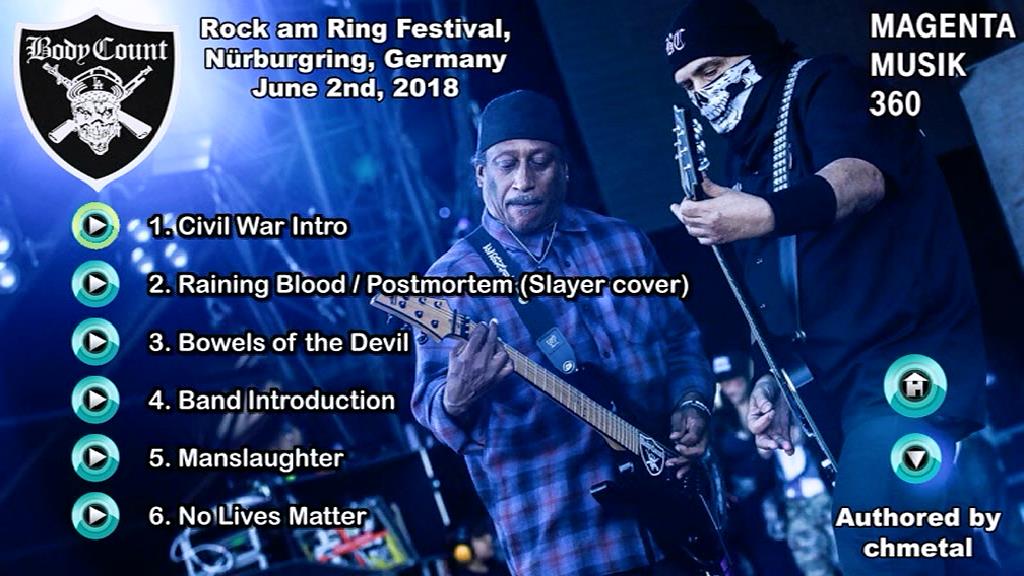 1. Civil War Intro 2. Raining Blood / Postmortem (Slayer cover) 3. Bowels of the Devil 4. Band Introduction 5. Manslaughter 6. No Lives Matter 7. Body Count 8. Necessary Evil 9. Drive By 10. Voodoo 11. There Goes the Neighborhood 12. Drum Solo 13. There Goes the Neighborhood (Reprise) 14. KKK Bitch 15. Disorder (The Exploited cover) 16. Talk Shit, Get Shot 17. Cop Killer