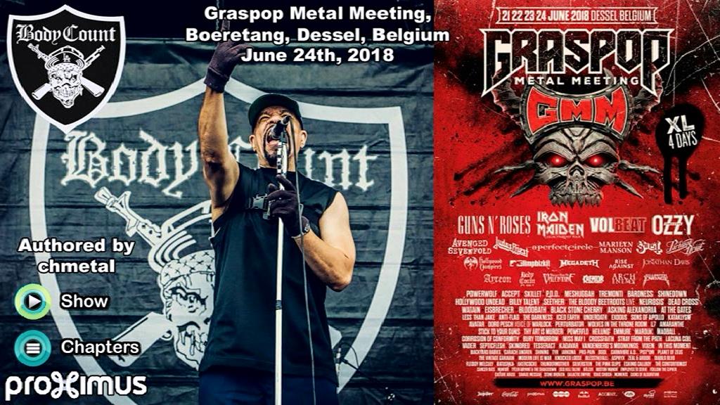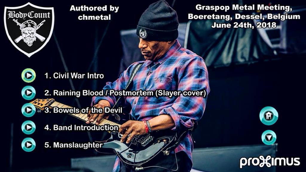 1. Intro* 2. Raining Blood / Postmortem (Slayer cover)* 3. Bowels of the Devil 4. Band Introduction 5. Manslaughter 6. No Lives Matter 7. Body Count 8. Necessary Evil 9. Drive By 10. Voodoo 11. There Goes the Neighborhood 12. Drum Solo 13. There Goes the Neighborhood (Reprise) 14. Talk Shit, Get Shot 15. Cop Killer