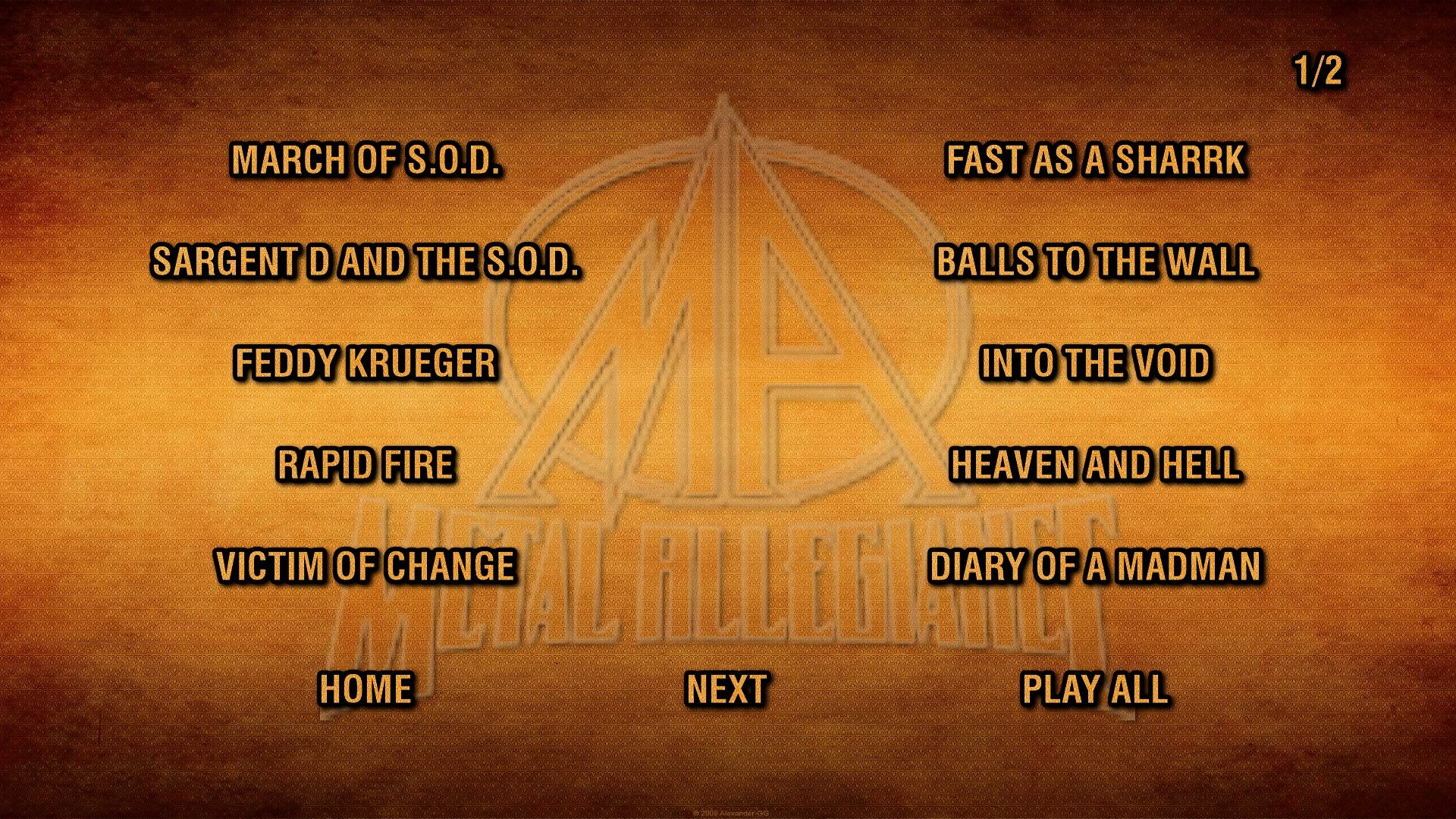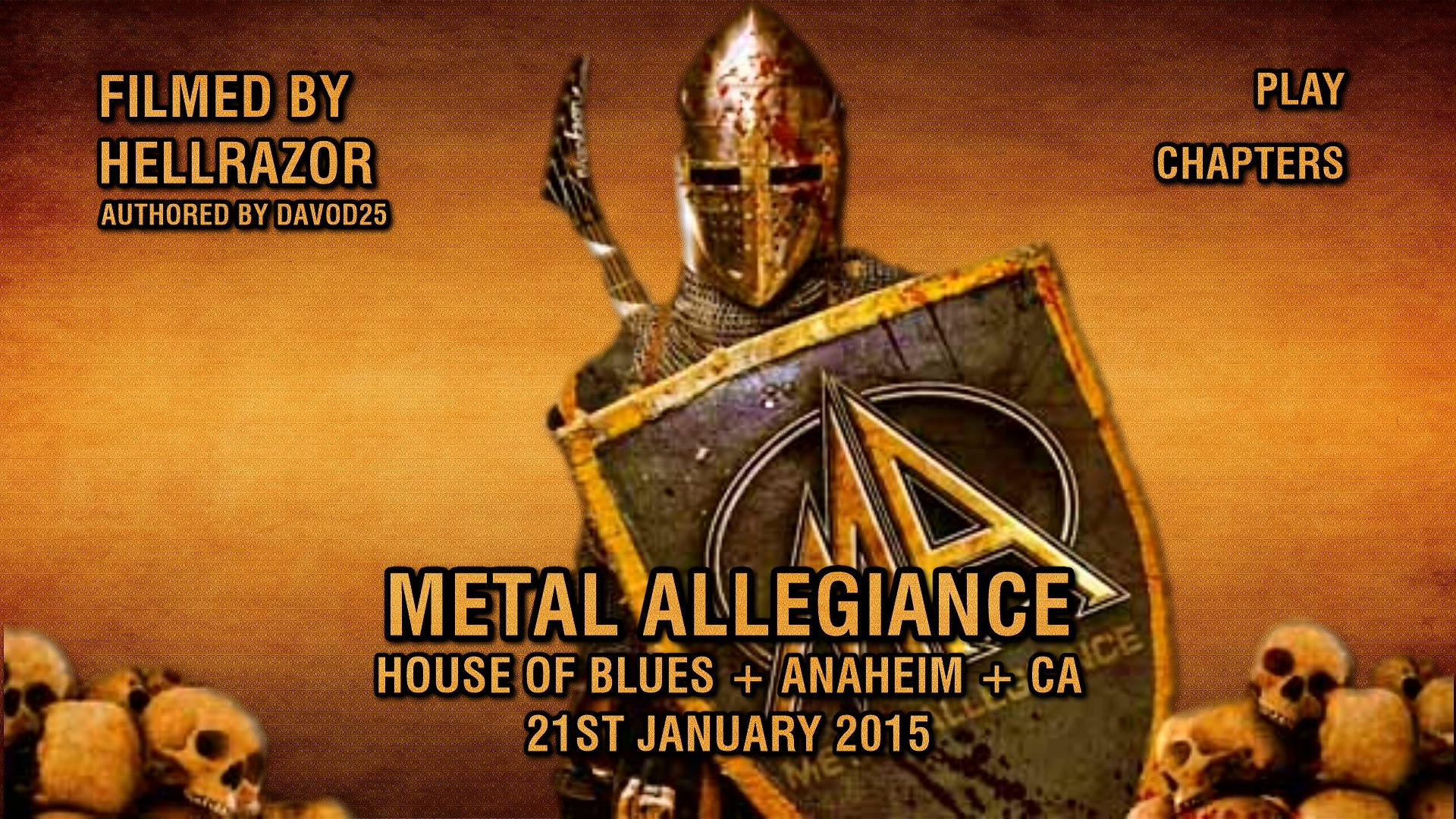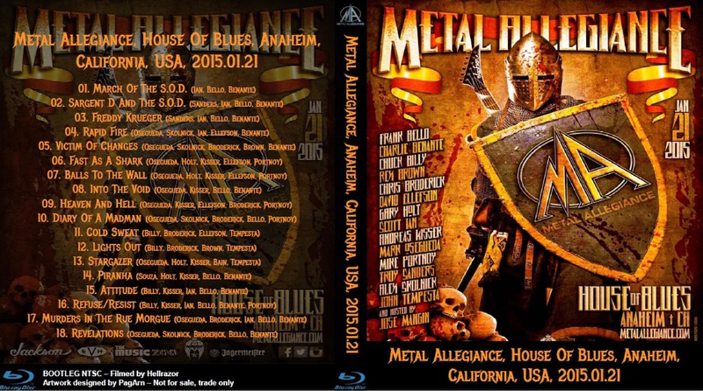 1. March of the SOD (Ian, Bello, Benante) 2. Sargent D And The S.O.D. (Sanders, Ian, Bello, Benante) 3. Freddy Krueger (Sanders, Ian, Bello, Benante) 4. Rapid Fire (Osegueda, Skolnick, Ian, Ellefson, Benante) 5. Victim of Changes (Osegueda, Skolnick, Broderick, Brown, Benante) 6. Fast as a Shark (Osegueda, Holt, Kisser, Ellefson, Portnoy ) 7. Balls to the Wall (Osegueda, Holt, Kisser, Ellefson, Portnoy) 8. Into the Void (Osegueda, Kisser, Bello, Benante) 9. Heaven and Hell (Osegueda, Kisser, Ellefson, Broderick, Portnoy) 10. Diary of a Madman (Osegueda, Skolnick, Broderick, Bello, Portnoy) 11. Cold Sweat (Billy, Broderick, Ellefson, Tempesta) 12. Lights Out (Billy, Broderick, Brown, Tempesta) 13. Stargazer (Osegueda, Holt, Kisser, Bain, Tempesta ) Kill the King (Osegueda, Holt, Kisser, Bain, Tempesta ) 14. Piranha (Souza, Holt, Kisser, Bello, Benante) 15. Attitude (Billy, Kisser, Ian, Bello, Benante) 16. Refuse/Resist (Billy, Kisser, Ian, Bello, Benante, Portnoy) Territory (Billy, Kisser, Ellefson, Ian, Portnoy) 17. Murders in the Rue Morgue (Osegueda, Broderick, Ian, Bello, Benante) 18. Revelations (Osegueda, Skolnick, Broderick, Bello, Benante) Runnin' With the Devil (Van Halen cover) (Skolnick, T. Sanders, Portnoy, K. Sanders) Eruption (Van Halen cover) (Skolnick, T. Sanders, Portnoy) You Really Got Me (The Kinks cover) Atomic Punk (Van Halen cover) (Skolnick, T. Sanders, Portnoy, K. Sanders) Cold Gin (KISS cover) (All "Metal Allegiance" on stage) I Love It Loud (KISS cover) (All "Metal Allegiance" on stage) Highway to Hell (AC/DC cover) (All "Metal Allegiance" on stage)