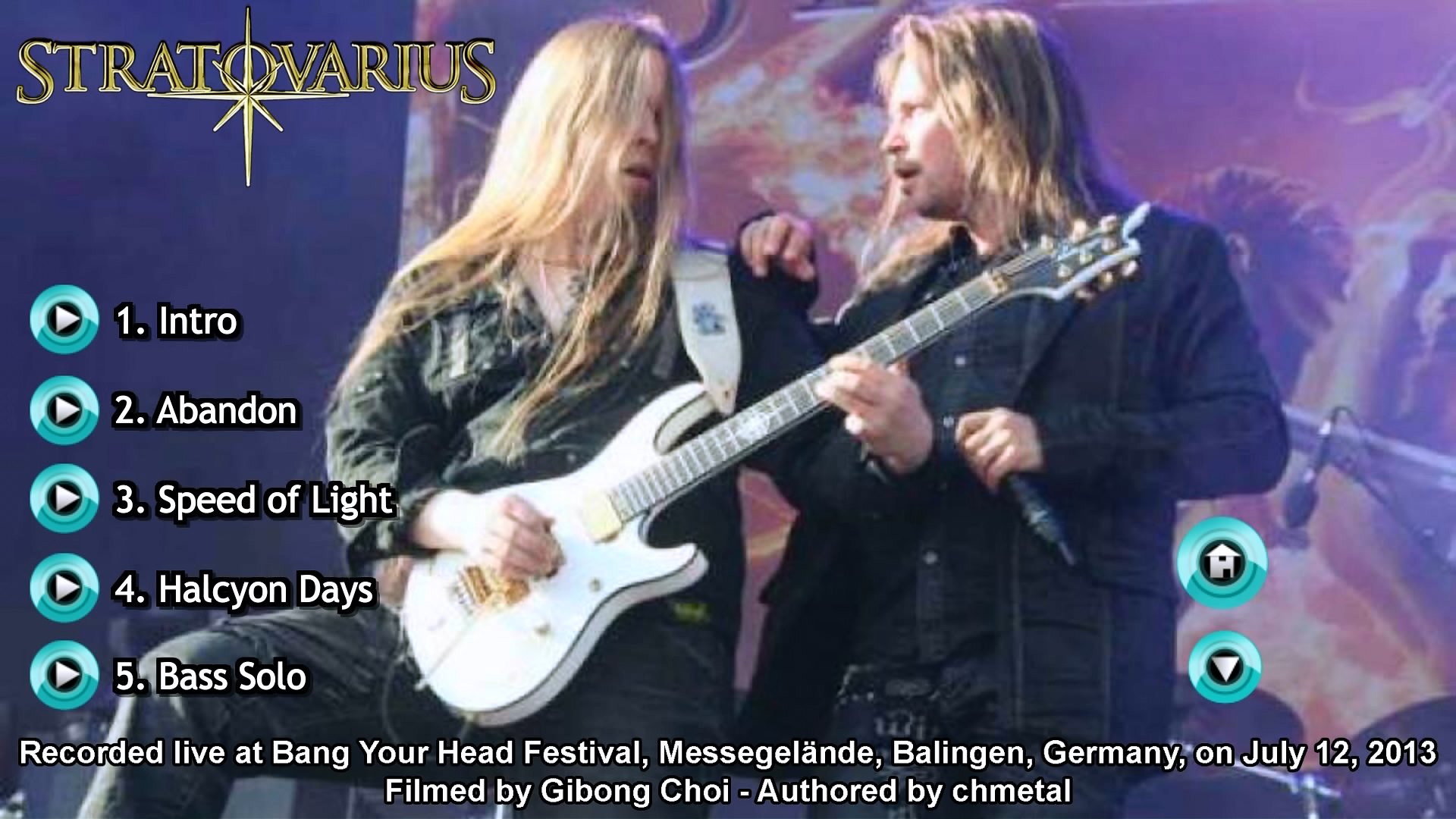 1. Intro 2. Abandon 3. Speed of Light 4. Halcyon Days 5. Bass Solo 6. The Kiss of Judas 7. Dragons 8. Against the Wind 9. Keyboard Solo 10. Black Diamond 11. Unbreakable 12. Hunting High and Low 13. Organizer speaks