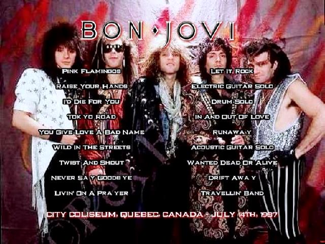 1. Pink Flamingos 2. Raise Your Hands 3. I'd Die for You 4. Tokyo Road 5. You Give Love a Bad Name 6. Wild in the Streets 7. Twist and Shout (Acoustic) 8. Never Say Goodbye 9. Livin' on a Prayer (Cuts in and out in between) 10. Let It Rock 11. Electric Guitar Solo 12. Drums Solo 13. In and Out of Love 14. Runaway 15. Acoustic Guitar Solo 16. Wanted Dead or Alive 17. Drift Away 18. Travellin' Band (With Cinderella)