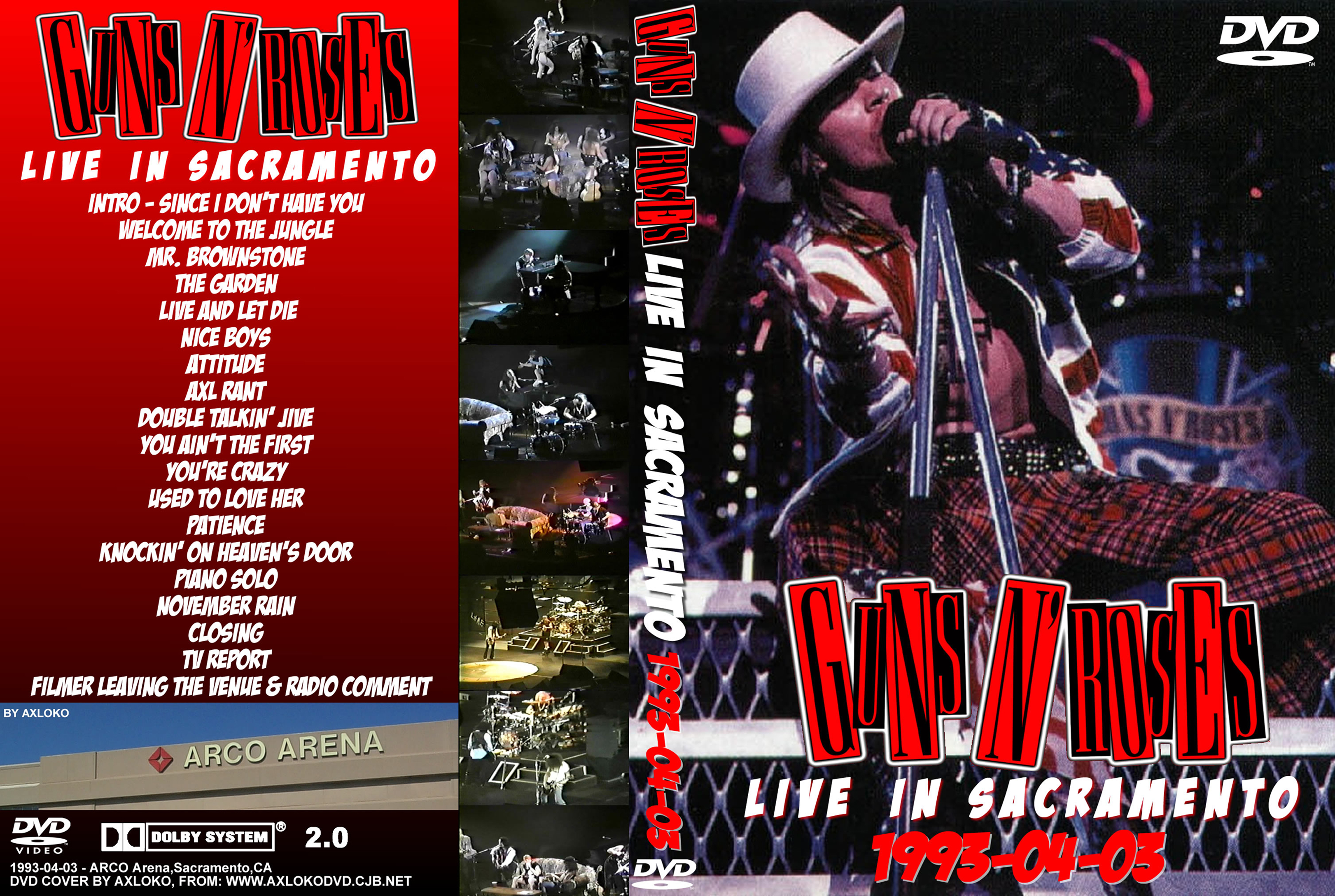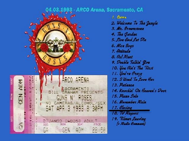 1. Intro 2. Welcome to the Jungle 3. Mr. Brownstone 4. The Garden 5. Live and Let Die 6. Nice Boys 7. Attitude 8. Axl Rant 9. Double Talkin' Jive 10. You Ain't the First 11. You’re Crazy 12. Used to Love Her 13. Patience 14. Knockin' on Heaven's Door 15. Piano Solo 16. November Rain 17. Closing