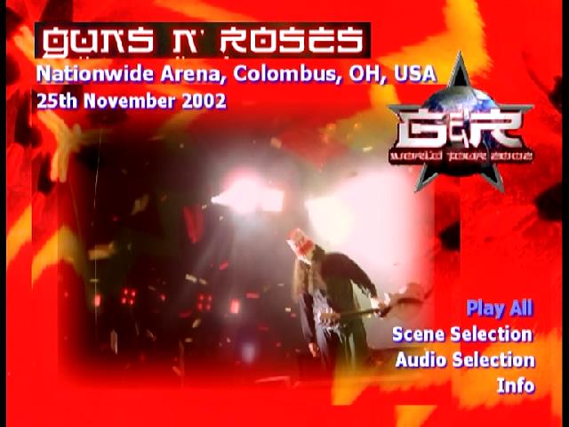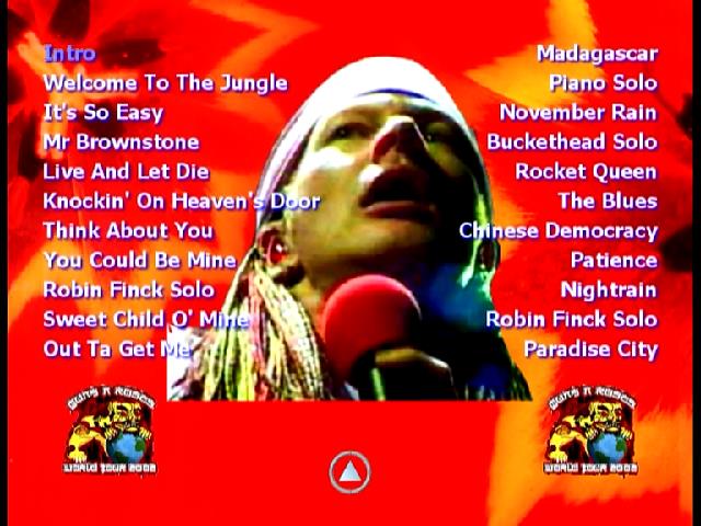 1. Intro 2. Welcome to the Jungle 3. It's So Easy 4. Mr. Brownstone 5. Live and Let Die 6. Knockin' on Heaven's Door 7. Think About You 8. You Could Be Mine 9. Robin Finck Solo 10. Sweet Child O' Mine 11. Out Ta Get Me 12. Madagascar 13. Piano Solo 14. November Rain 15. Buckethead Solo 16. Rocket Queen 17. The Blues 18. Chinese Democracy 19. Patience 20. Nightrain 21. Robin Finck Solo 22. Paradise City