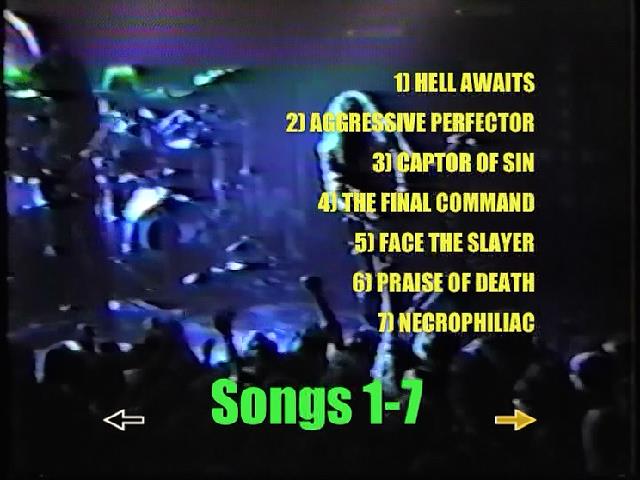 1. Hells Awaits 2. Aggressive Perfector 3. Captor of Sin 4. The Final Command 5. Face the Slayer 6. Praise of Death 7. Necrophilliac 8. The Antichrist 9. Chemical Warfare 10. No Fight Til Death 11. Black Magic 12. Die by the Sword 13. Evil Has No Boundaries 14. Haunting the Chapel 15. Show No Mercy