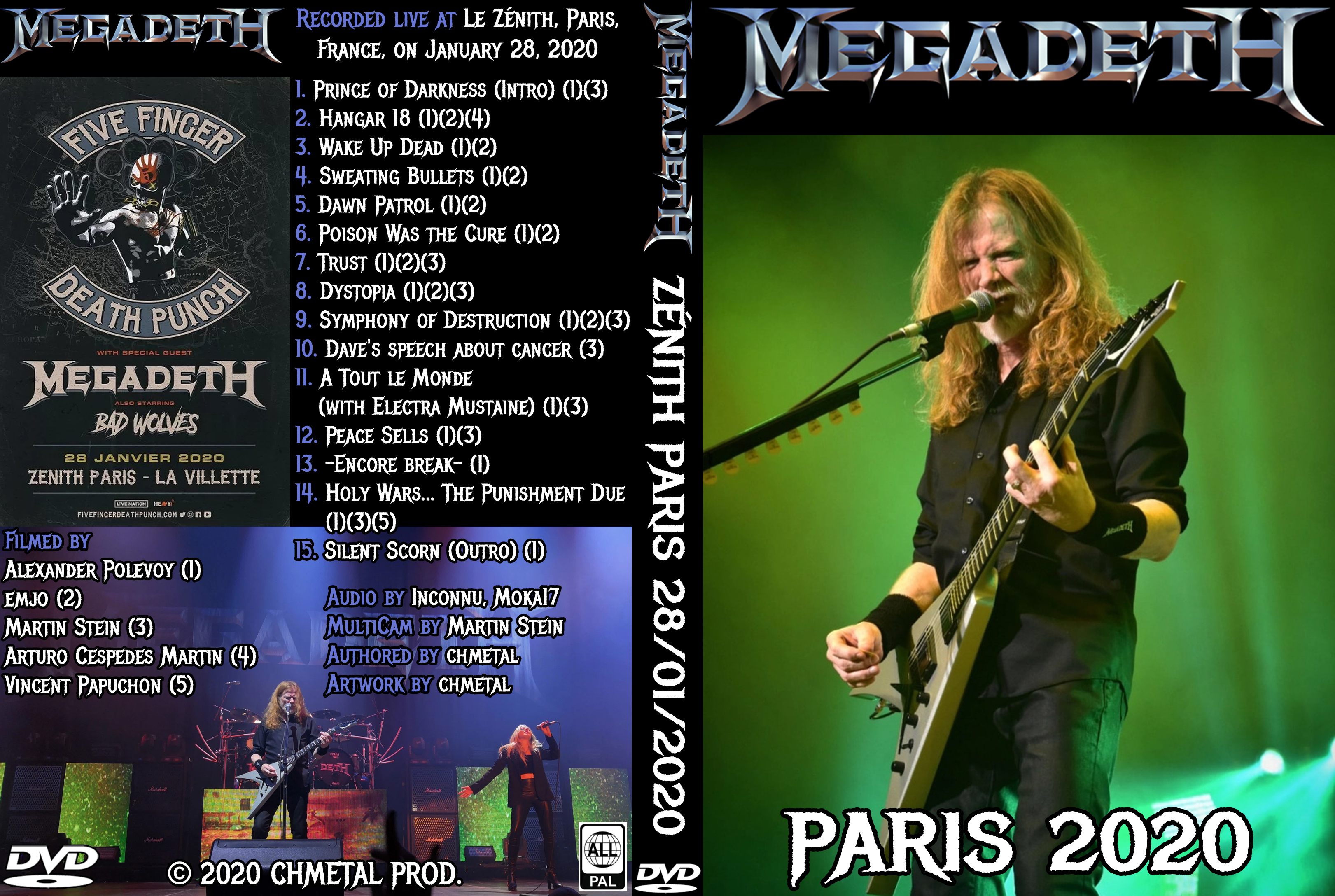 1. Prince of Darkness (Intro) (1)(3) 2. Hangar 18 (1)(2)(4) 3. Wake Up Dead (1)(2) 4. Sweating Bullets (1)(2) 5. Dawn Patrol (1)(2) 6. Poison Was the Cure (1)(2) 7. Trust (1)(2)(3) 8. Dystopia (1)(2)(3) 9. Symphony of Destruction (1)(2)(3) 10. Dave's speech about cancer (3) 11. A Tout le Monde (with Electra Mustaine) (1)(3) 12. Peace Sells (1)(3) 13. -Encore break- (1) 14. Holy Wars... The Punishment Due (1)(3)(5) 15. Silent Scorn (Outro) (1)