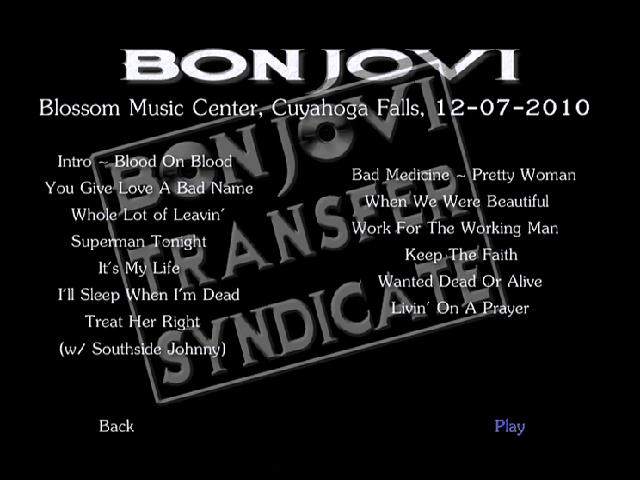 1. Intro / Blood on Blood 2. You Give Love a Bad Name 3. Whole Lot of Leavin' 4. Superman Tonight 5. It's My Life 6. I'll Sleep When I'm Dead 7. Treat Her Right 8. Bad Medicine (with Pretty Woman) 9. When We Were Beautiful 10. Work for the Working Man 11. Keep the Faith 12. Wanted Dead or Alive 13. Livin' on a Prayer