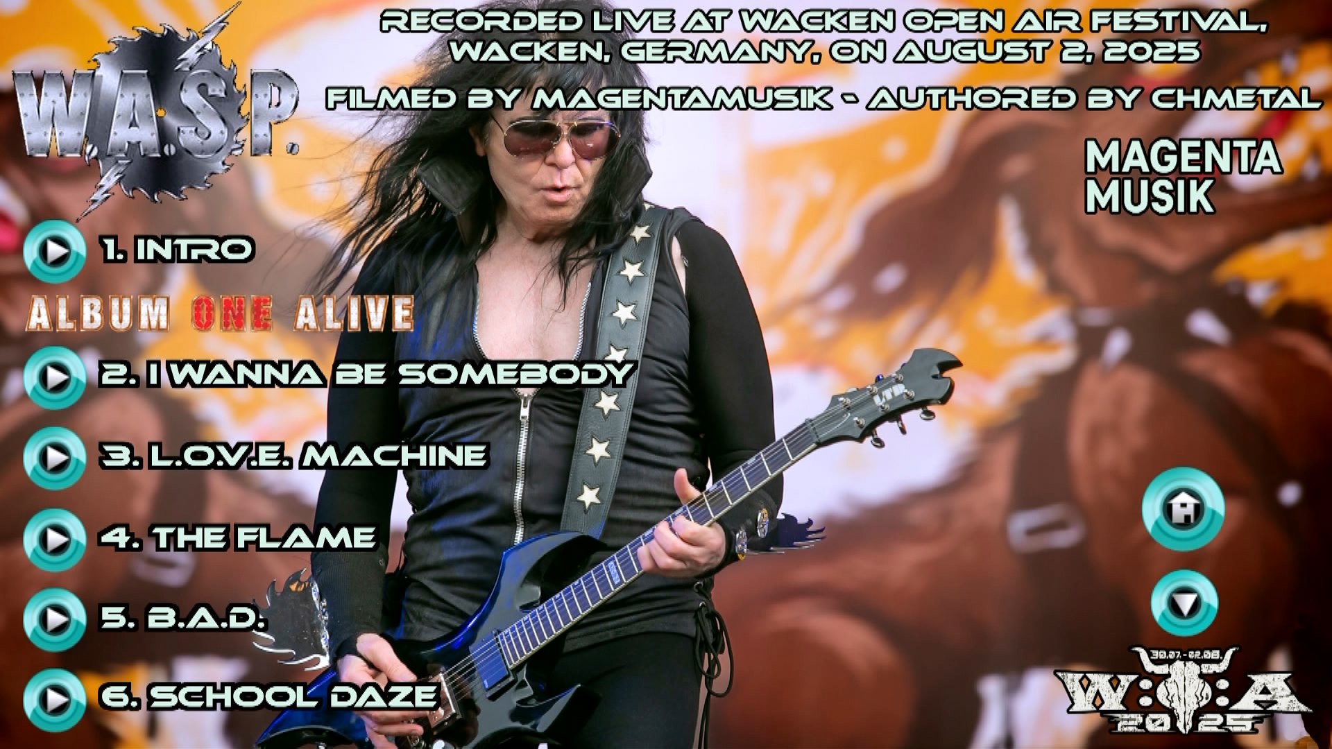 1. Intro --------------------------------------------------------------------------- ALBUM ONE ALIVE 2. I Wanna Be Somebody 3. L.O.V.E. Machine 4. The Flame 5. B.A.D. 6. School Daze 7. Hellion 8. Sleeping (in the Fire) 9. On Your Knees 10. Tormentor 11. The Torture Never Stops --------------------------------------------------------------------------- 12. The Real Me 13. Forever Free 14. The Headless Children 15. Wild Child 16. Blind in Texas