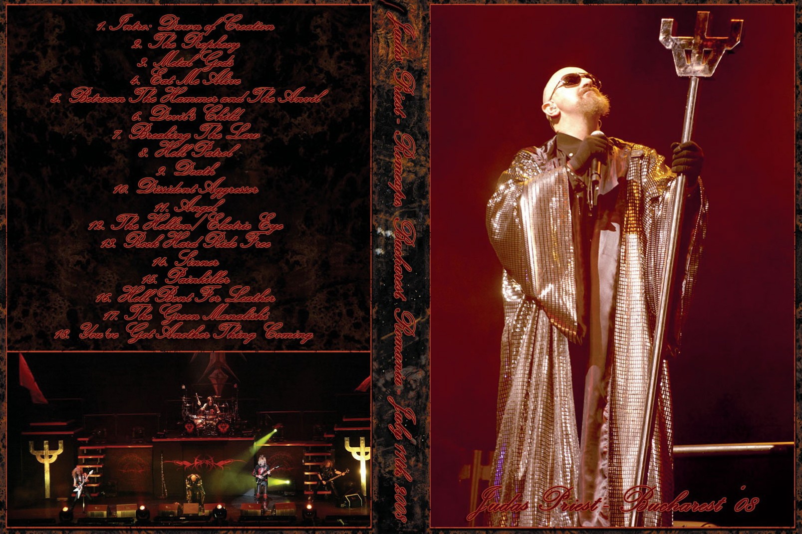 1. Intro: Dawn of Creation 2. Prophecy 3. Metal Gods 4. Eat Me Alive 5. Between the Hammer and the Anvil 6. Devil's Child 7. Breaking the Law 8. Hell Patrol 9. Death 10. Dissident Aggressor 11. Angel 12. The Hellion / Electric Eye 13. Rock Hard, Ride Free 14. Sinner 15. Painkiller 16. Hell Bent for Leather 17. The Green Manalishi (With the Two-Pronged Crown) 18. You've Got Another Thing Coming